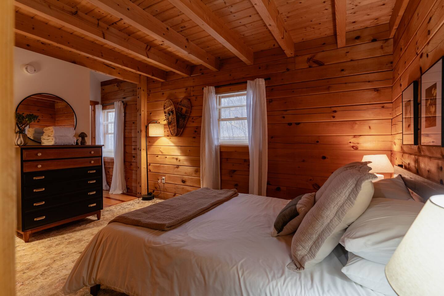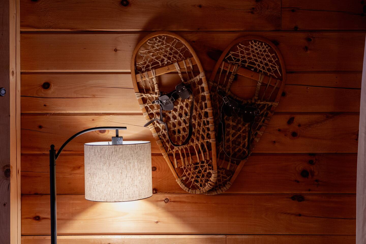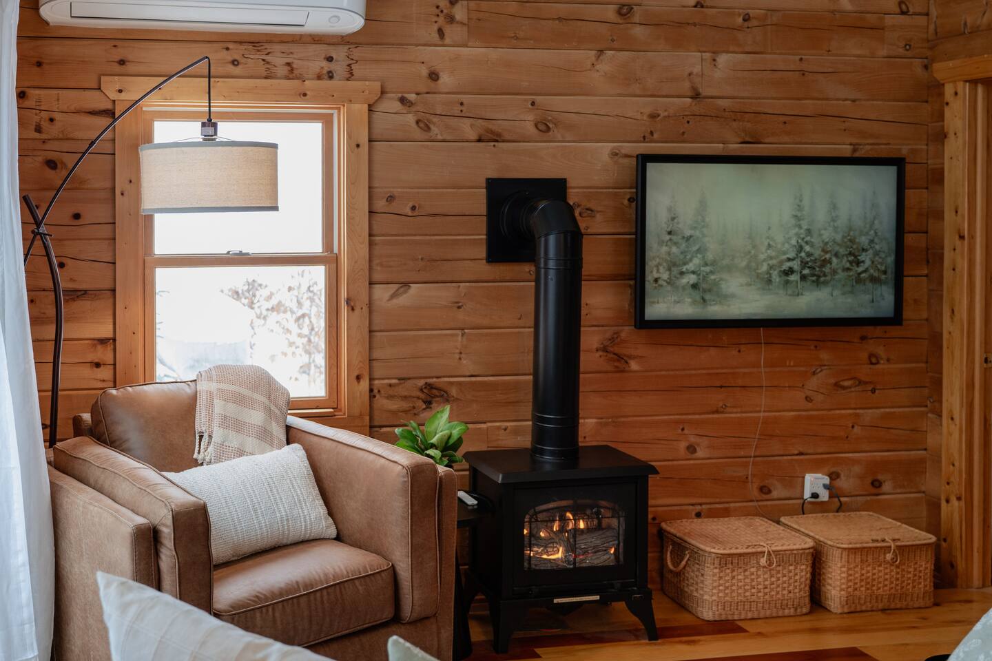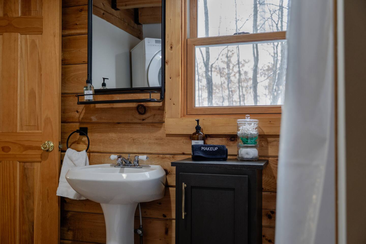 The cabin is a 2 bedroom, 1 bathroom home with a fully stocked kitchen, dining and living areas. Off the front of the cabin is a large deck outfitted with Adirondack chairs and a solo stove for bonfires. The kitchen comes with a drip coffee pot, tea kettle, a full set of pots and pans, and cooking basics like salt, pepper, and oil. The living room has a cozy gas fireplace as well as a 55 inch smart TV where you can log into any of your streaming services. There is also a full kitchen table where you can gather to eat a meal or play some of the provided board games. Tucked into the corner of the cabin is the first bedroom that has a queen bed and dresser. The ensuite bathroom is stocked with fresh towels, shampoo, conditioner, body wash, and a hairdryer. There is a large capacity washer and dryer located in the bathroom as well. Upstairs in the open loft is a second bedroom with a king sized bed and a dresser. Please be aware this bedroom is open to the main floor. On the front deck there are chairs and the solo stove available for guest use. Wood is provided on site. There is also snowshoes provided in the deck box. The open area next to the cabin is approved for snowmobile use as well, maps can be provided for allowed areas.