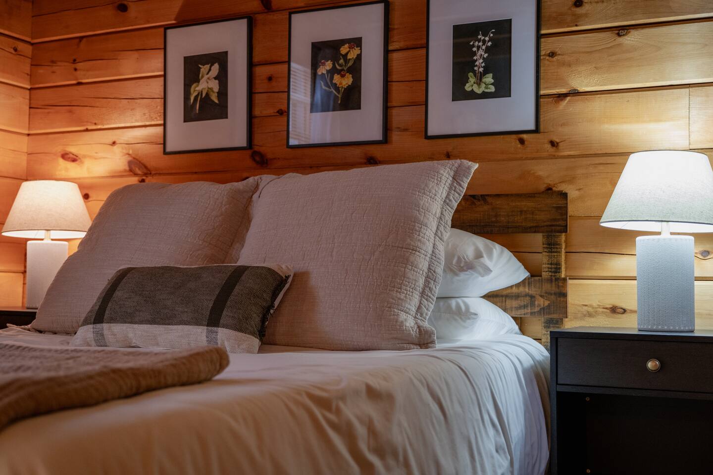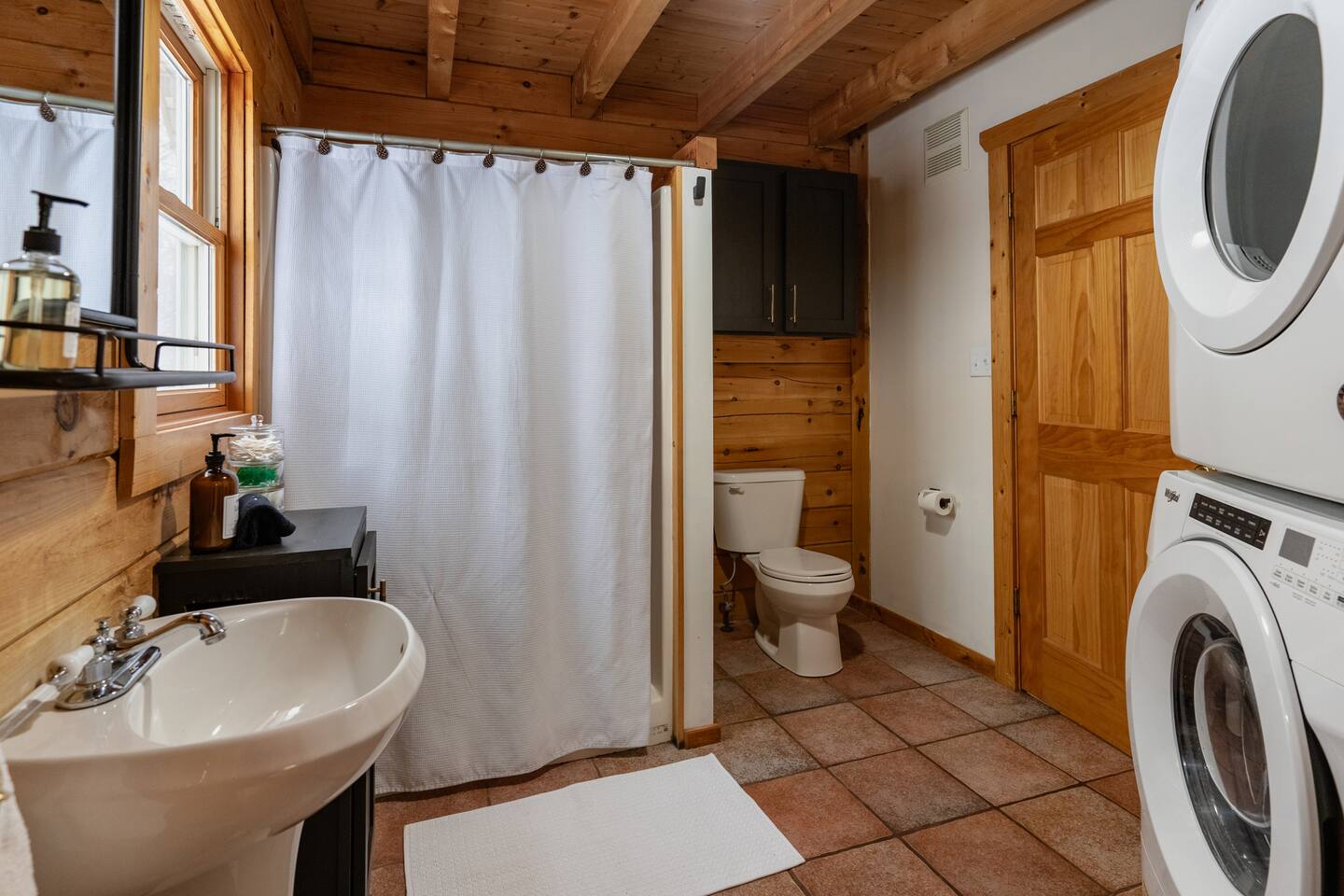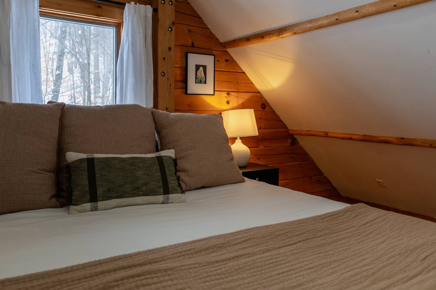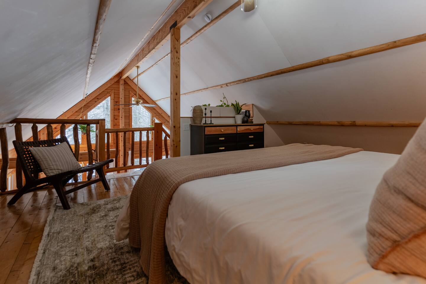 The cabin is a 2 bedroom, 1 bathroom home with a fully stocked kitchen, dining and living areas. Off the front of the cabin is a large deck outfitted with Adirondack chairs and a solo stove for bonfires. The kitchen comes with a drip coffee pot, tea kettle, a full set of pots and pans, and cooking basics like salt, pepper, and oil. The living room has a cozy gas fireplace as well as a 55 inch smart TV where you can log into any of your streaming services. There is also a full kitchen table where you can gather to eat a meal or play some of the provided board games. Tucked into the corner of the cabin is the first bedroom that has a queen bed and dresser. The ensuite bathroom is stocked with fresh towels, shampoo, conditioner, body wash, and a hairdryer. There is a large capacity washer and dryer located in the bathroom as well. Upstairs in the open loft is a second bedroom with a king sized bed and a dresser. Please be aware this bedroom is open to the main floor. On the front deck there are chairs and the solo stove available for guest use. Wood is provided on site. There is also snowshoes provided in the deck box. The open area next to the cabin is approved for snowmobile use as well, maps can be provided for allowed areas.