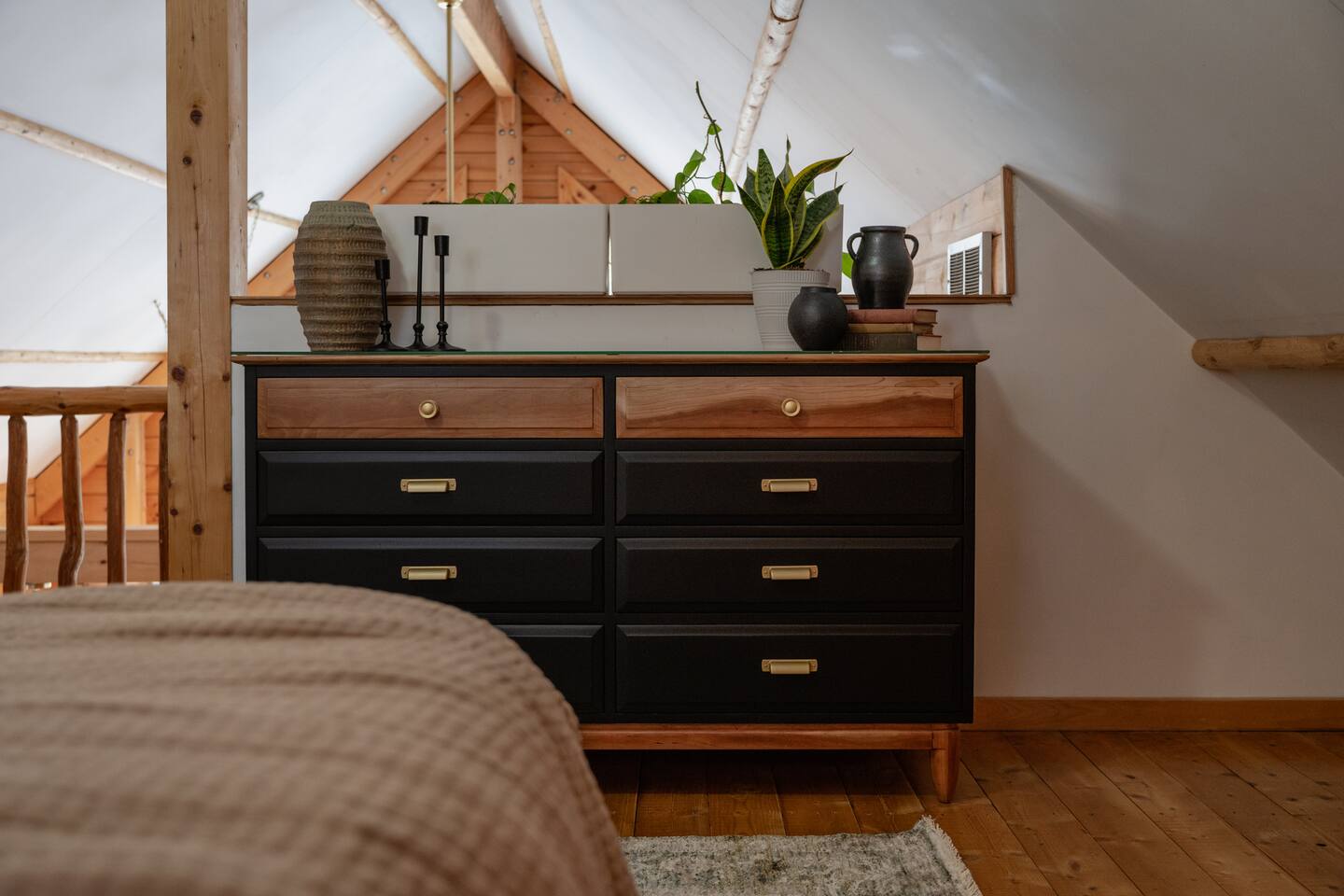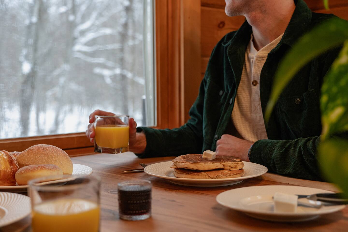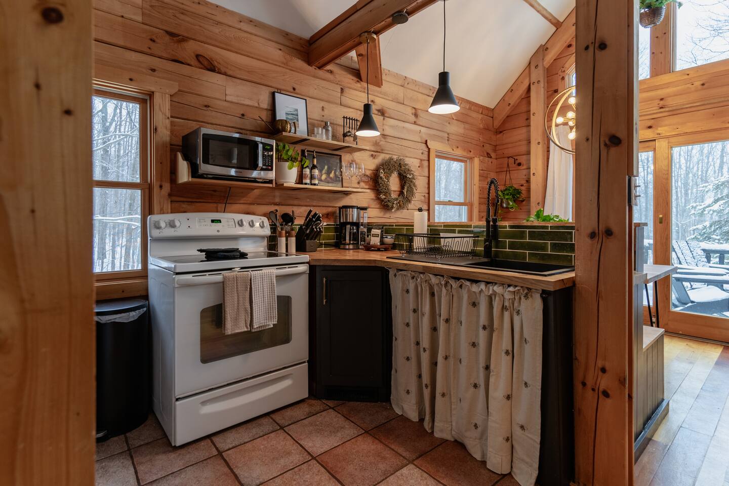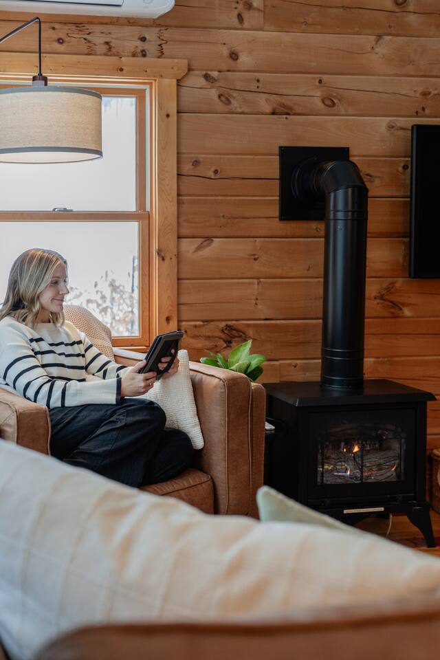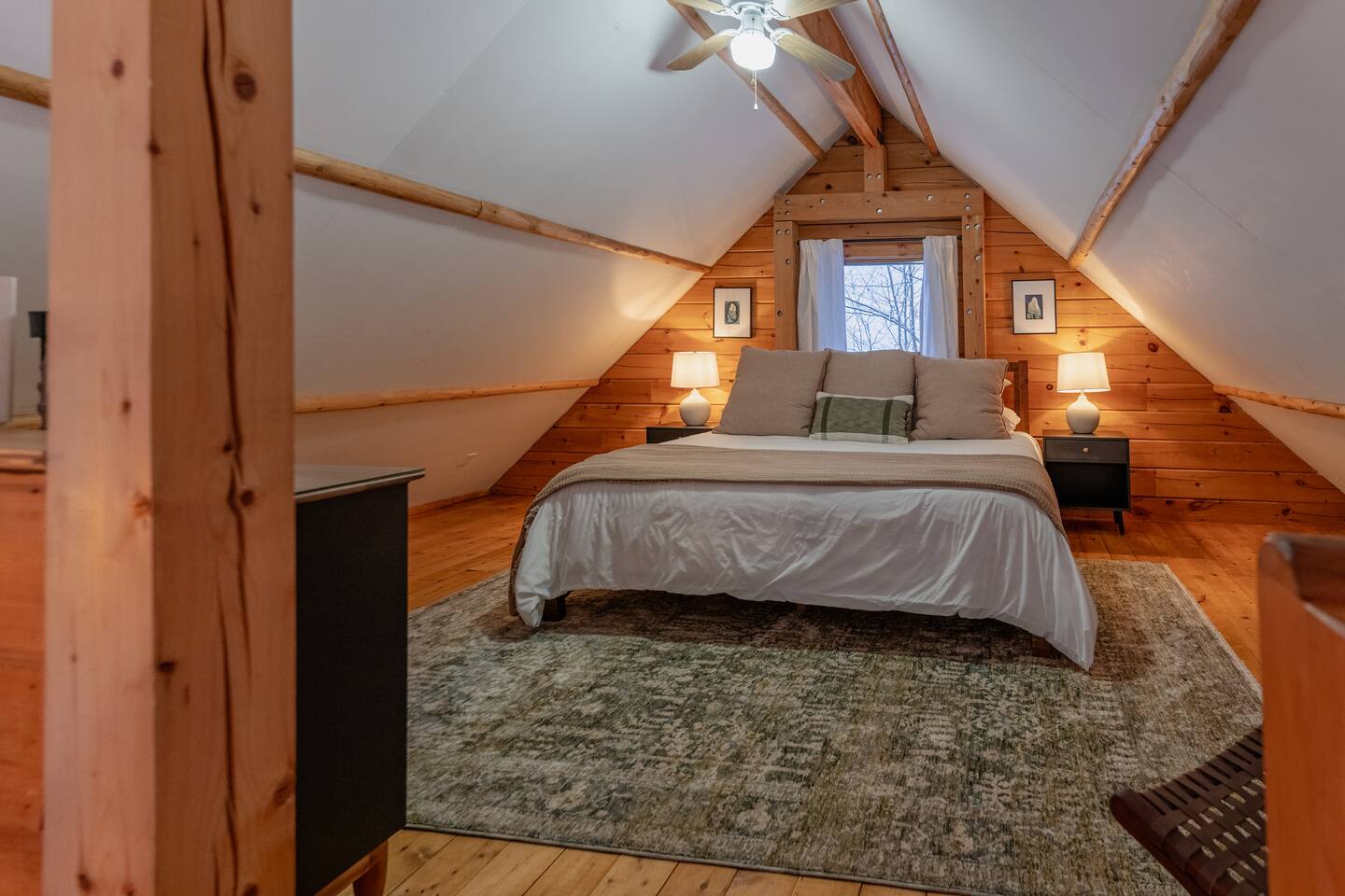The cabin is a 2 bedroom, 1 bathroom home with a fully stocked kitchen, dining and living areas. Off the front of the cabin is a large deck outfitted with Adirondack chairs and a solo stove for bonfires. The kitchen comes with a drip coffee pot, tea kettle, a full set of pots and pans, and cooking basics like salt, pepper, and oil. The living room has a cozy gas fireplace as well as a 55 inch smart TV where you can log into any of your streaming services. There is also a full kitchen table where you can gather to eat a meal or play some of the provided board games. Tucked into the corner of the cabin is the first bedroom that has a queen bed and dresser. The ensuite bathroom is stocked with fresh towels, shampoo, conditioner, body wash, and a hairdryer. There is a large capacity washer and dryer located in the bathroom as well. Upstairs in the open loft is a second bedroom with a king sized bed and a dresser. Please be aware this bedroom is open to the main floor. On the front deck there are chairs and the solo stove available for guest use. Wood is provided on site. There is also snowshoes provided in the deck box. The open area next to the cabin is approved for snowmobile use as well, maps can be provided for allowed areas.