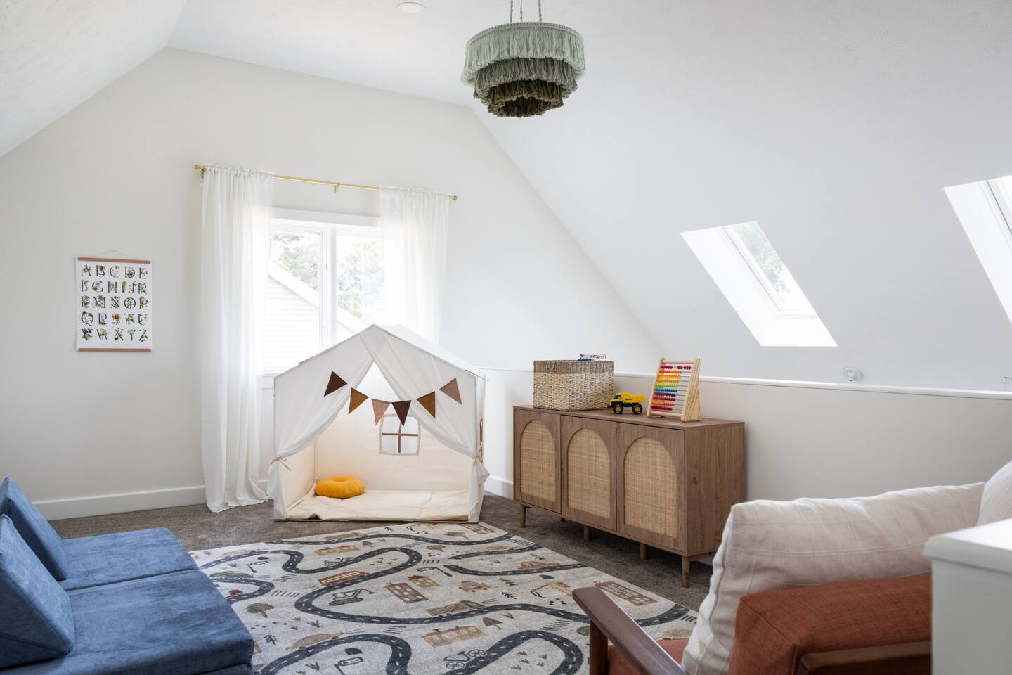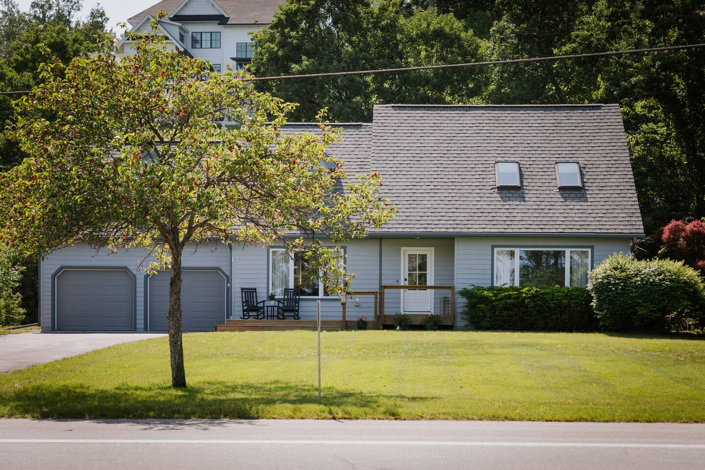 This property offers 3 bedrooms, 2 bathrooms, a playroom, a large living area, and a fully stocked kitchen. You will also have access to the 2 car garage, a fenced backyard, a front patio with seating, and a large private deck with bay views across the road. On the main floor, your group can gather around the dining room table while listening to music, playing games, or drinking wine. In the adjacent room is a large, fully stocked kitchen with an island for your whole group to gather and cook a meal. While you cook, guests can lounge in the living room equipped with a 55 inch TV and a record player. The TV comes with access to hulu live, ESPN, and Disney+ as well as any of your own streaming services The main floor also has the master bedroom with a king bed and attached bathroom. A pack n play, sound machine, and baby monitors are provided for travelers with small children. Upstairs you will find a bathroom and 2 more bedrooms; the first with a king sized bed and the second with 2 queen beds. There is also a desk for digital nomads who may be mixing work with travel. In the loft area is a playroom equipped with a play tent, play couch, kids toys, and books. Bedrooms all have new memory foam mattresses, bedding, extra pillows, and blankets. Both bathrooms in the home are stocked with fresh towels, shampoo, conditioner, body wash, and a hairdryer. There is a large capacity washer and dryer located in the kitchen for guest use. Across the road is a set of stairs leading to a large deck that overlooks West Traverse Bay. The beach is rocky but with the correct shoes, this is a great location to sip a cocktail and have a swim! Elmwood Permit Number: 2024-60