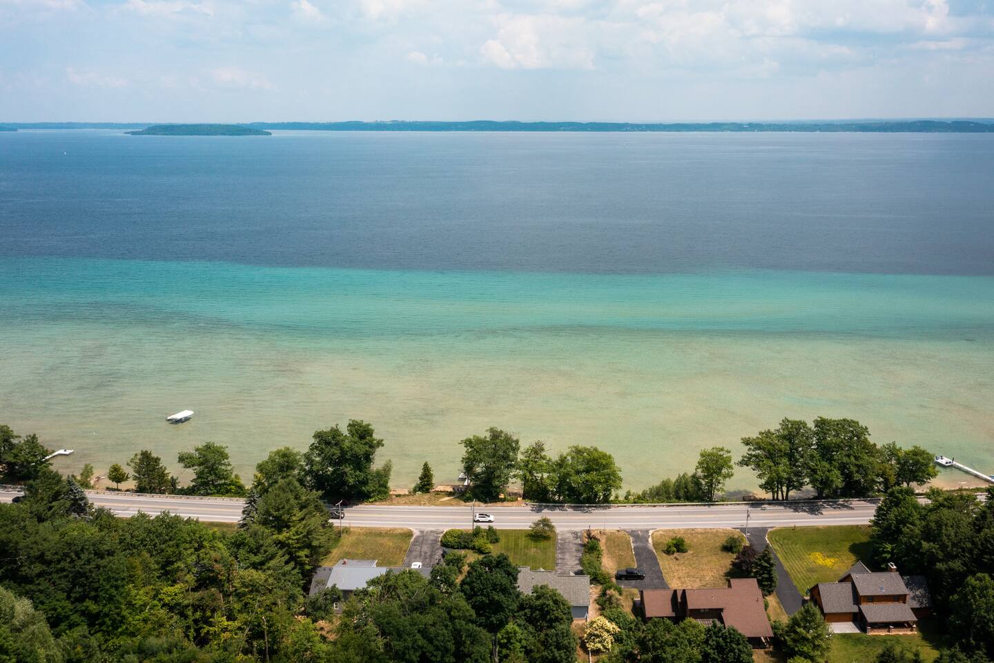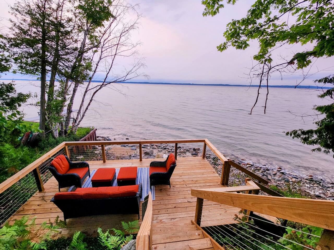 Welcome to the Hemlock House hosted by Wander North Rentals! This home is located on M22 just 10 minutes north of Traverse City nestled in the beauty of Leelanau County. Included in your stay is a private lake frontage across the road on West Traverse Bay with a large deck. This property is designed for use by friends wishing to visit wineries, families enjoying the trails and beaches offered in Leelanau County, and business professionals looking to take meetings with a lake view.