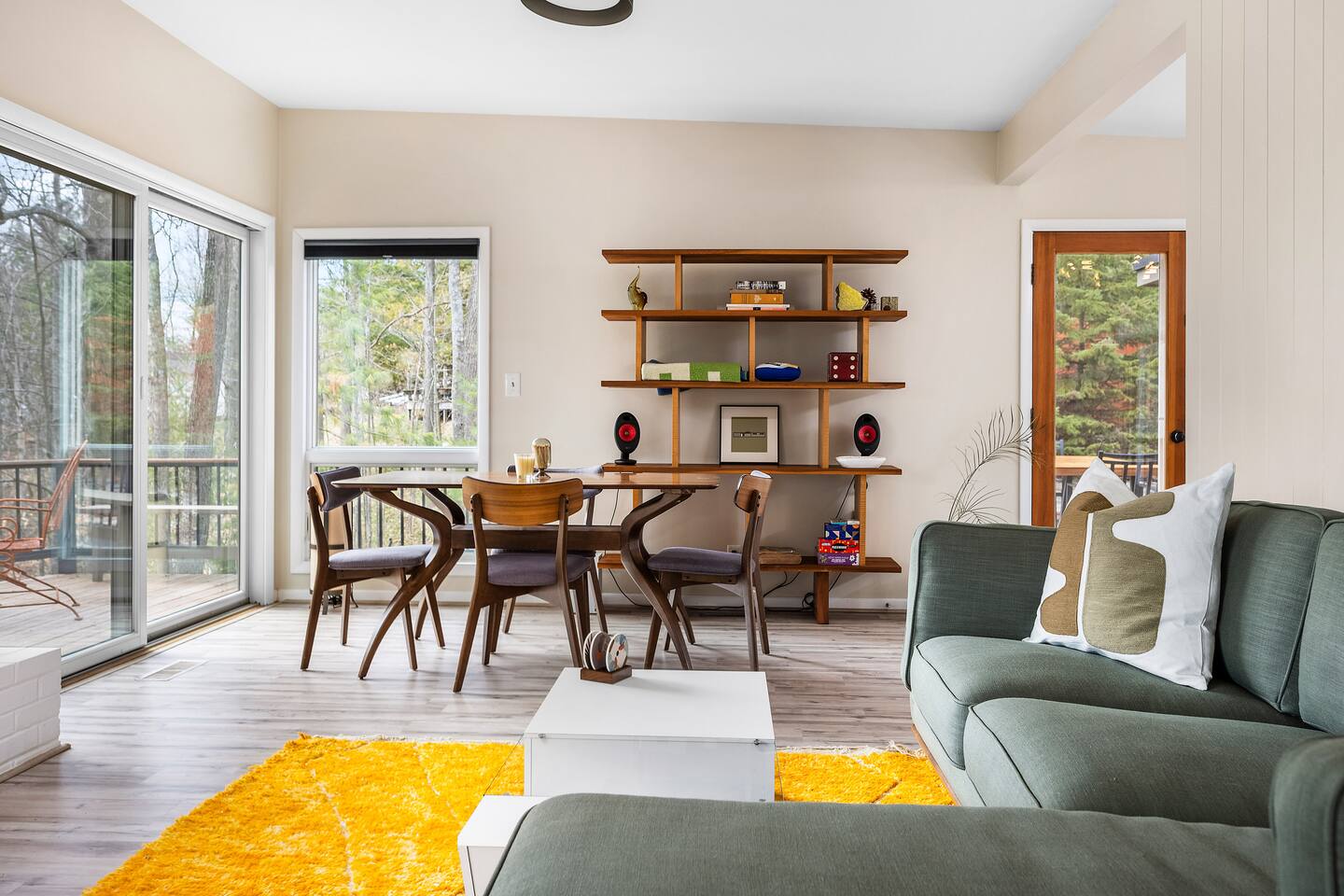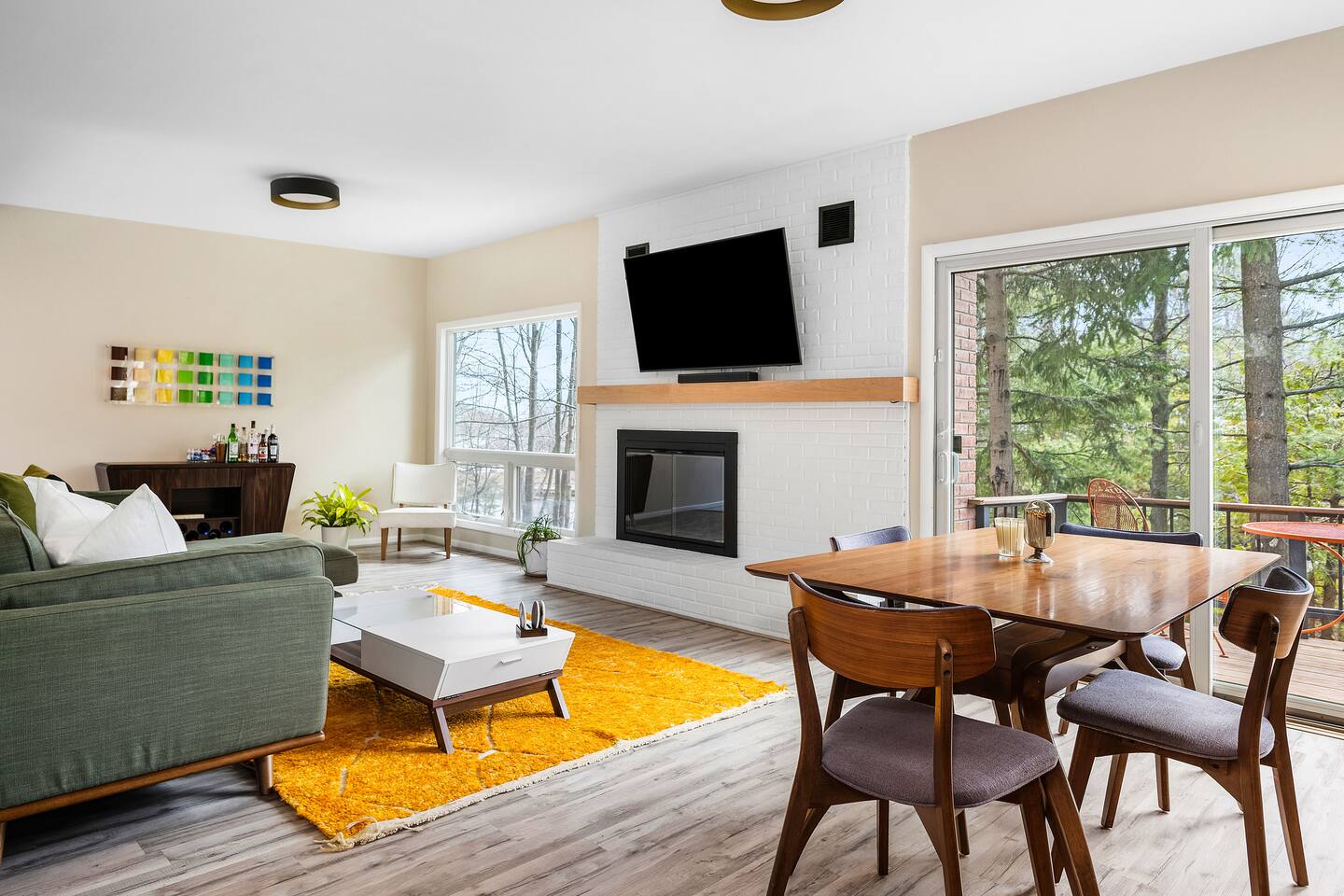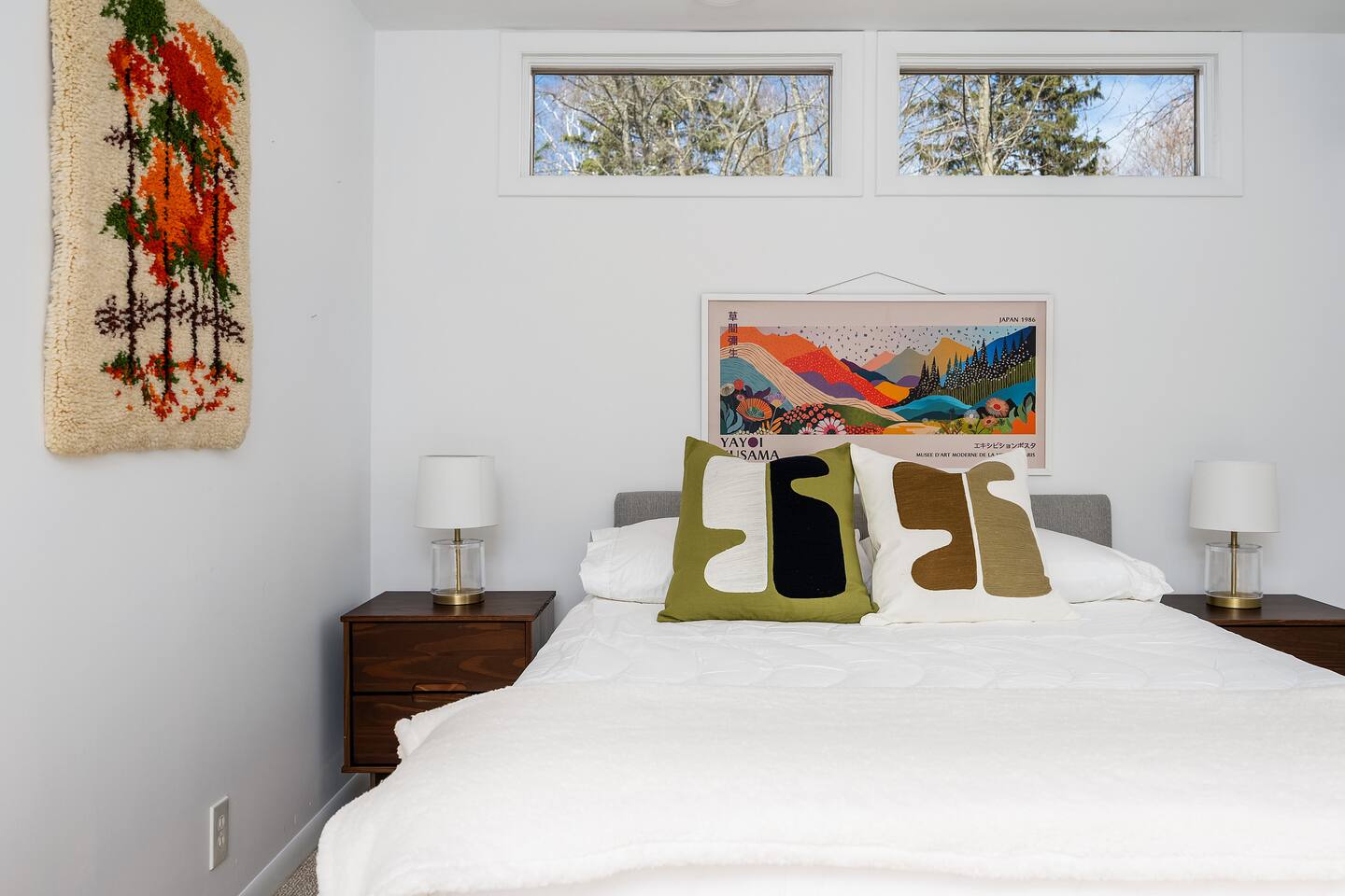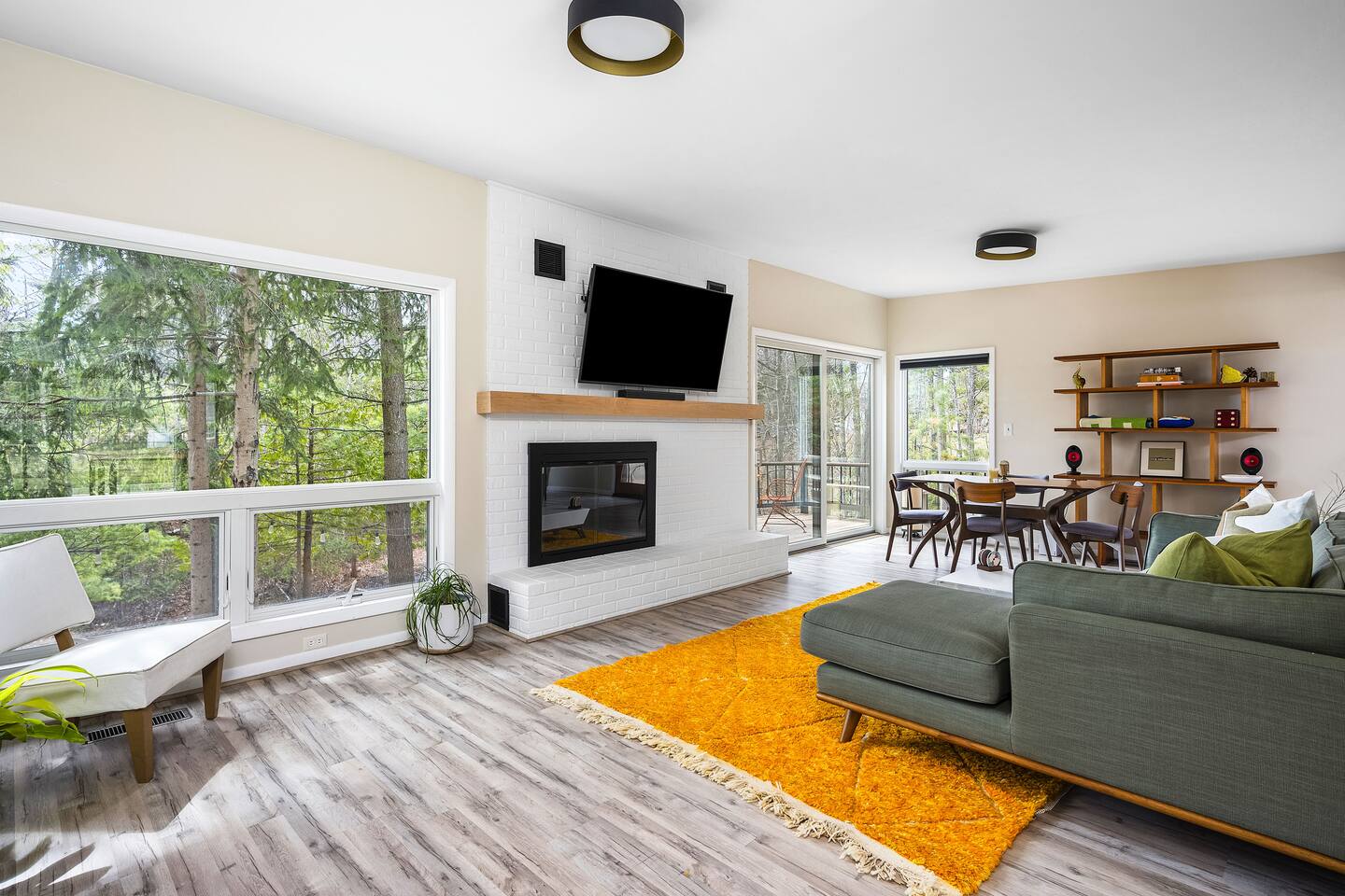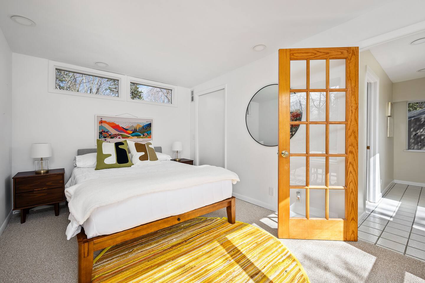 Nestled on the banks of the historic Mill Pond, the home embraces true mid-century design with clean lines, floor-to-ceiling windows, and an open concept living space that brings the outdoors in. Original wood beams, stone fireplace, and period furnishings create the perfect backdrop for your northern Michigan getaway. The large patio and wraparound deck allows you to entertain amongst the lush tree canopy, peaceful water, and sounds of nature including blue herons, turtles, otters, and hummingbirds. The sunlit living area opens to a spacious deck where you can enjoy morning coffee while watching birds glide across the pond. Evenings are magical as the water reflects the changing sky – perfect for sharing stories and a glass of local wine. Two livings rooms create comfortable spaces to read or watch a show after a long day exploring the offerings of the Leelanau Pensinula. SLEEPING ARRANGEMENTS Master bedroom: King bed with on en-suite bathroom. Bathroom has heated floors and triple shower heads Second bedroom: Queen with cozy reading nook Third bedroom: Twin day bed Fourth bedroom: Queen bed with full wall views of the mill pond THE LOCATION Our Mill Pond retreat sits in a quiet neighborhood just two blocks from Northport's charming downtown. You're perfectly positioned to explore all that Leelanau Peninsula has to offer: 3-minute walk to Northport Marina and beach 5-minute walk to local shops, restaurants, and coffee 10-minute drive to wineries and hiking trails 15 minutes to Leland's historic Fishtown 30 minutes to Sleeping Bear Dunes National Lakeshore 30 minutes to Traverse City M22, Michigan's scenic coastal highway, is just steps away – your gateway to endless adventures along the shoreline. THE DETAILS Free parking onsite Fully equipped kitchen with coffee maker, microwave, and all essentials Outdoor patio with bistro lights and a fire pit Washer and dryer for your convenience Smart TV in main floor and basement living rooms Come experience the perfect blend of mid-century style and northern Michigan charm. The Mill Pond awaits!