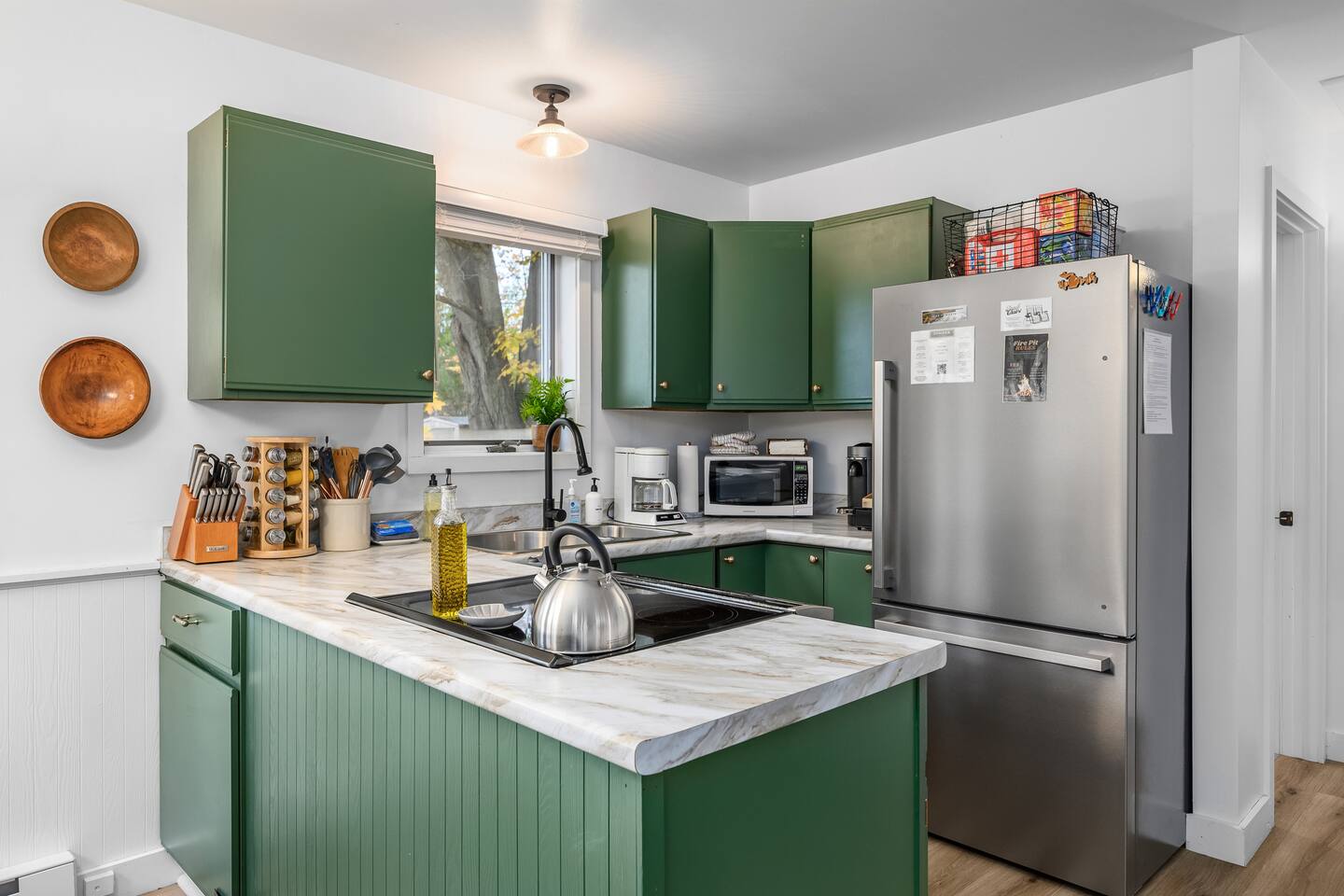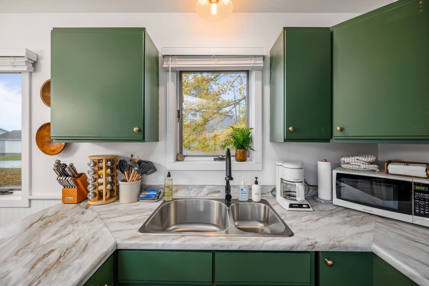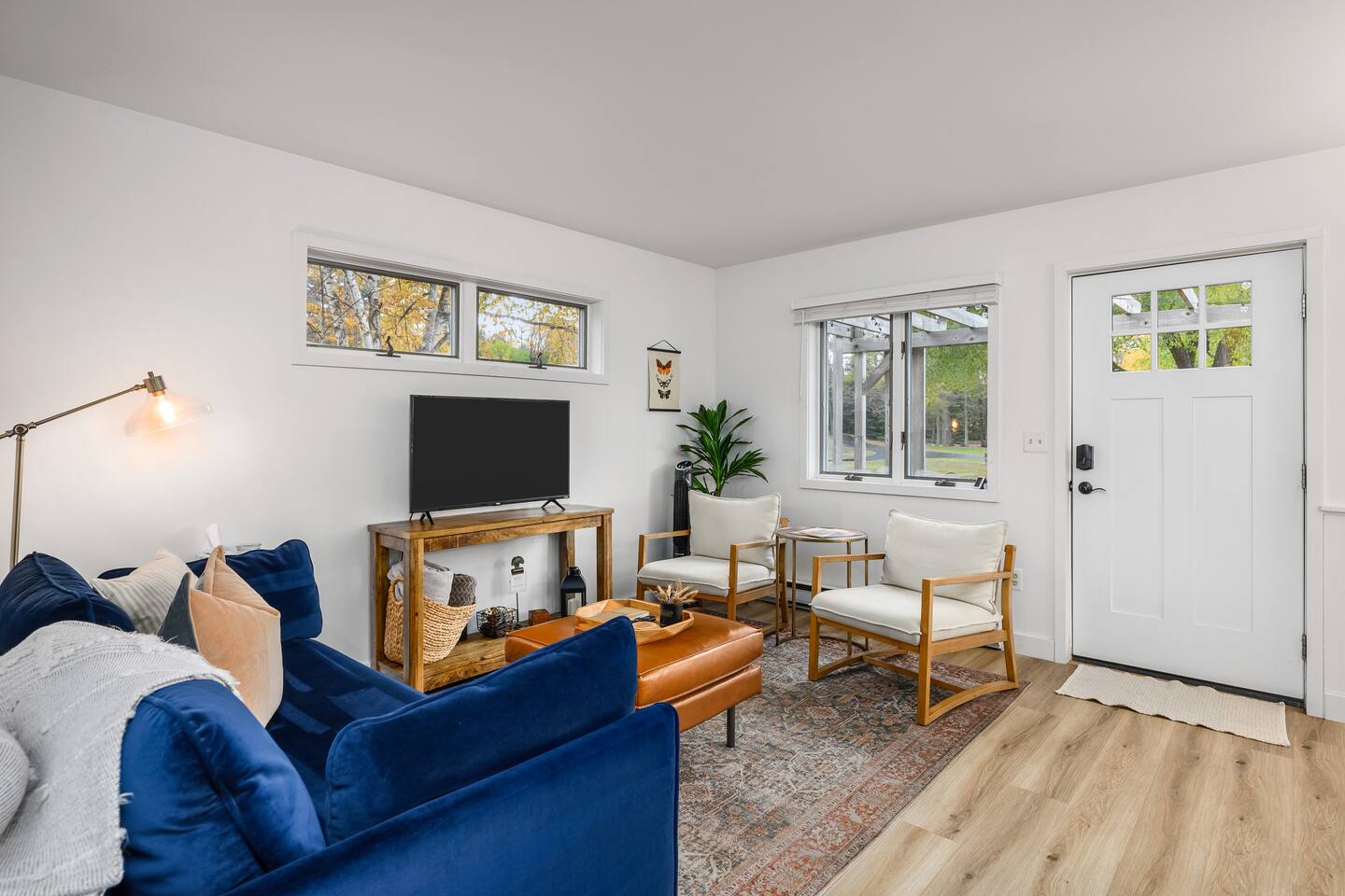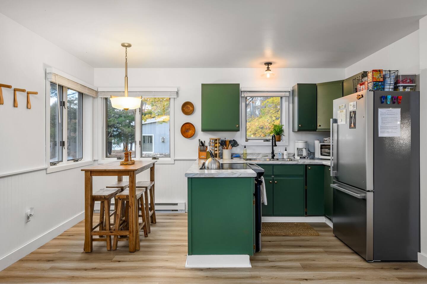 The Little Dipper is a tiny haven nestled on the shores of Grand Traverse Bay. When you arrive, there is parking available for 2 cars out front. The front door will lead you into the main open floor plan living area of this cottage. The kitchen is newly renovated and fully stocked with pots and pans, dishes, utensils, spices, and small appliances for cooking meals. In the living room, there is a pull-out couch, as well as seating for your whole group to watch the Roku TV. In the back of the unit, you will find the bedroom and bathroom. The bedroom has a queen size bed, nightstands, and a dresser. The bathroom is newly renovated and includes a full soaker tub and shower. Linens, towels, shampoo, conditioner, body wash and paper products are included in your stay. In addition to the condo, you have access to 400 feet of shared lakefrontage and beach. The shoreline can be a little rocky, so bring your water shoes to get the most enjoyment out of the bay. We can also help you set up rentals for water sports gear such as paddle boards and kayaks.